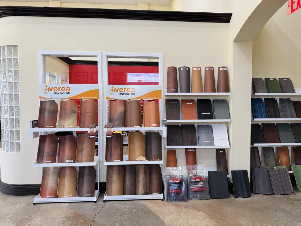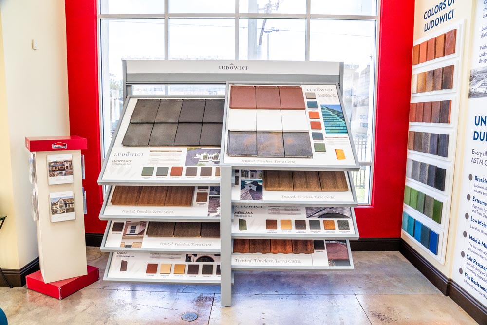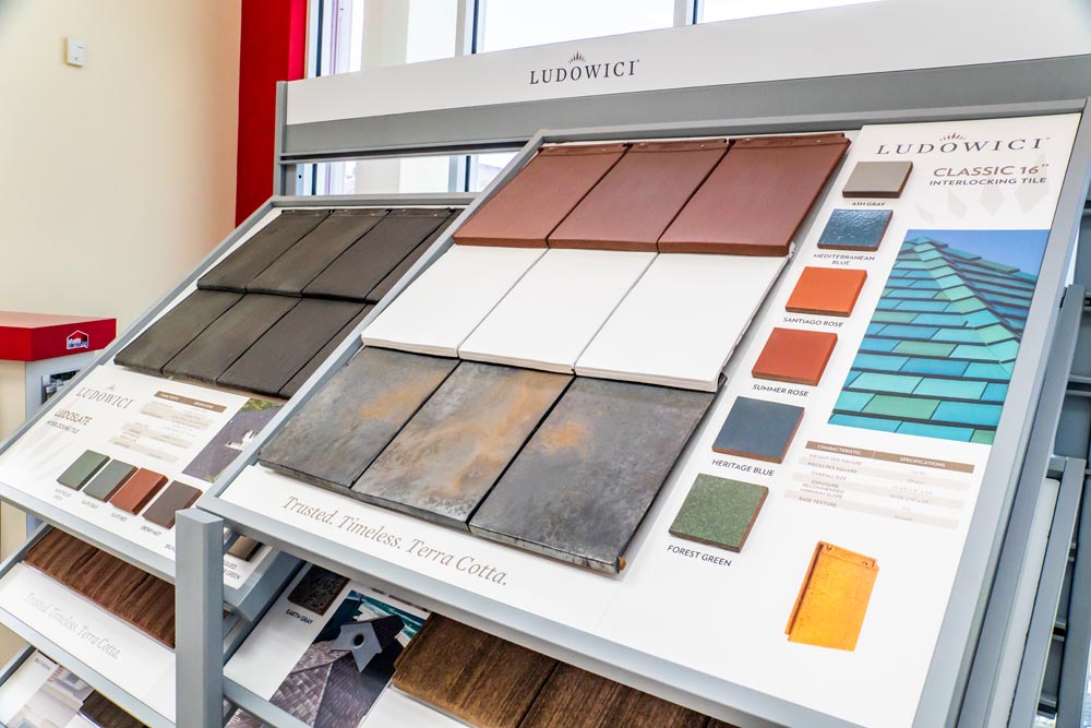 The showroom features a curated selection of roofing materials: