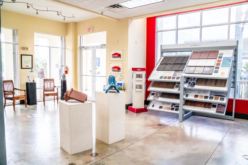 The showroom features a curated selection of roofing materials: